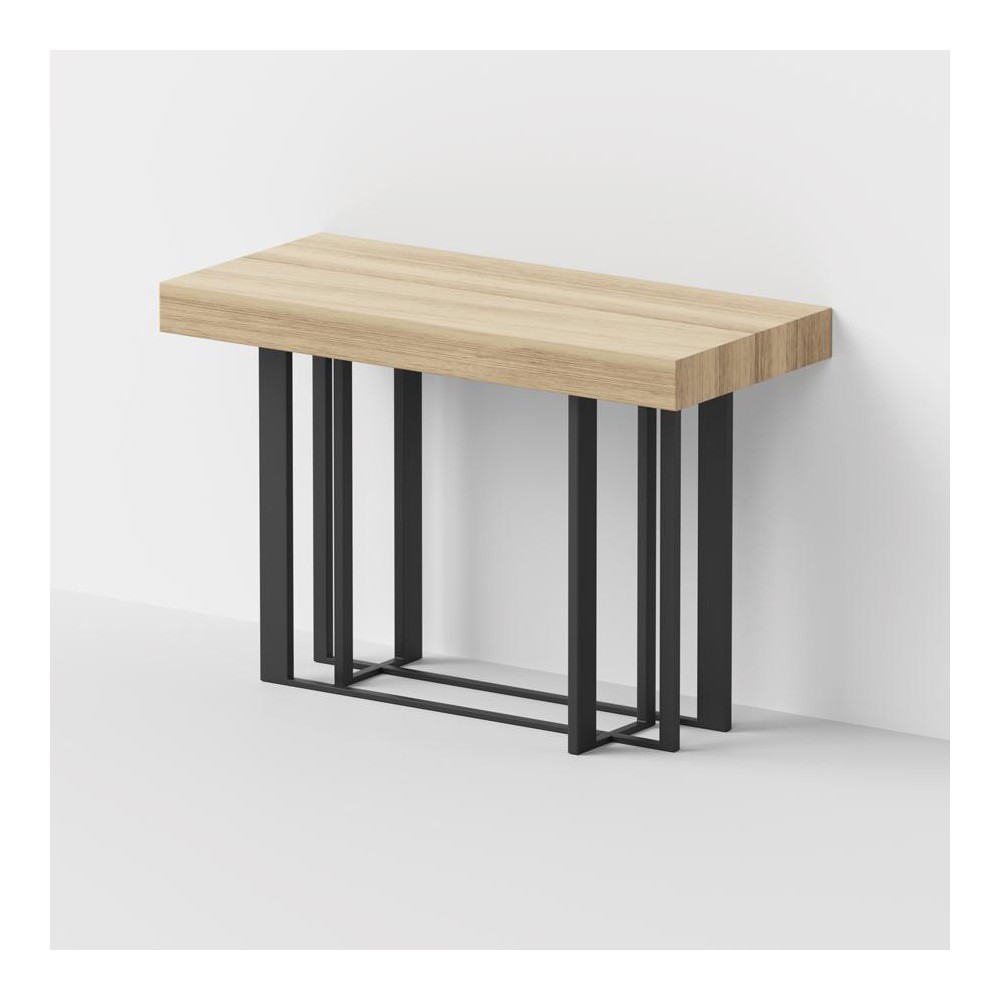 Tavolo-Consolle trasformabile con struttura in acciaio verniciato sablé e top in laminato ecologico con lavorazione folding. Il tavolo viene fornito completo di 2 allunghe da cm 42 cad che trovano alloggiamento in un contenitore all'interno della struttura. Coperti: fino a 6 persone
